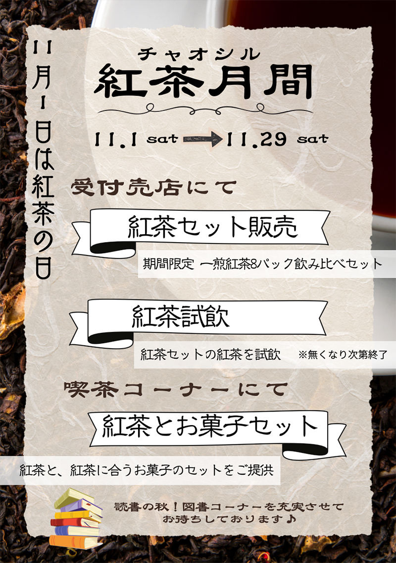 11月1日の「紅茶の日」にちなんで、チャオシルでは11月を紅茶月間として、うれしの紅茶を楽しんでいただけるイベントを開催します!ぜひご来館ください。